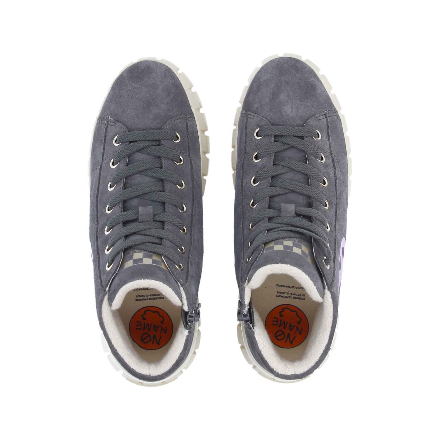 NO NAME has come out with a new take on vintage styles with the PLAY MID, a grey suede high-top platform sneaker. This extremely lightweight sneaker is trimmed with retro purple logos that match the laces. Its lugged rubber sole ensures excellent cushioning and grip, while the organic cotton insole reduces its environmental impact. This comfy high-top will boldly up your height and your style. -Calfskin suede upper -XL logo on the sides -Heel insert with printed logo -Polyester textile lining -Removable GOTS-certified 100% organic cotton insole -Flat laces -4.5 cm sole