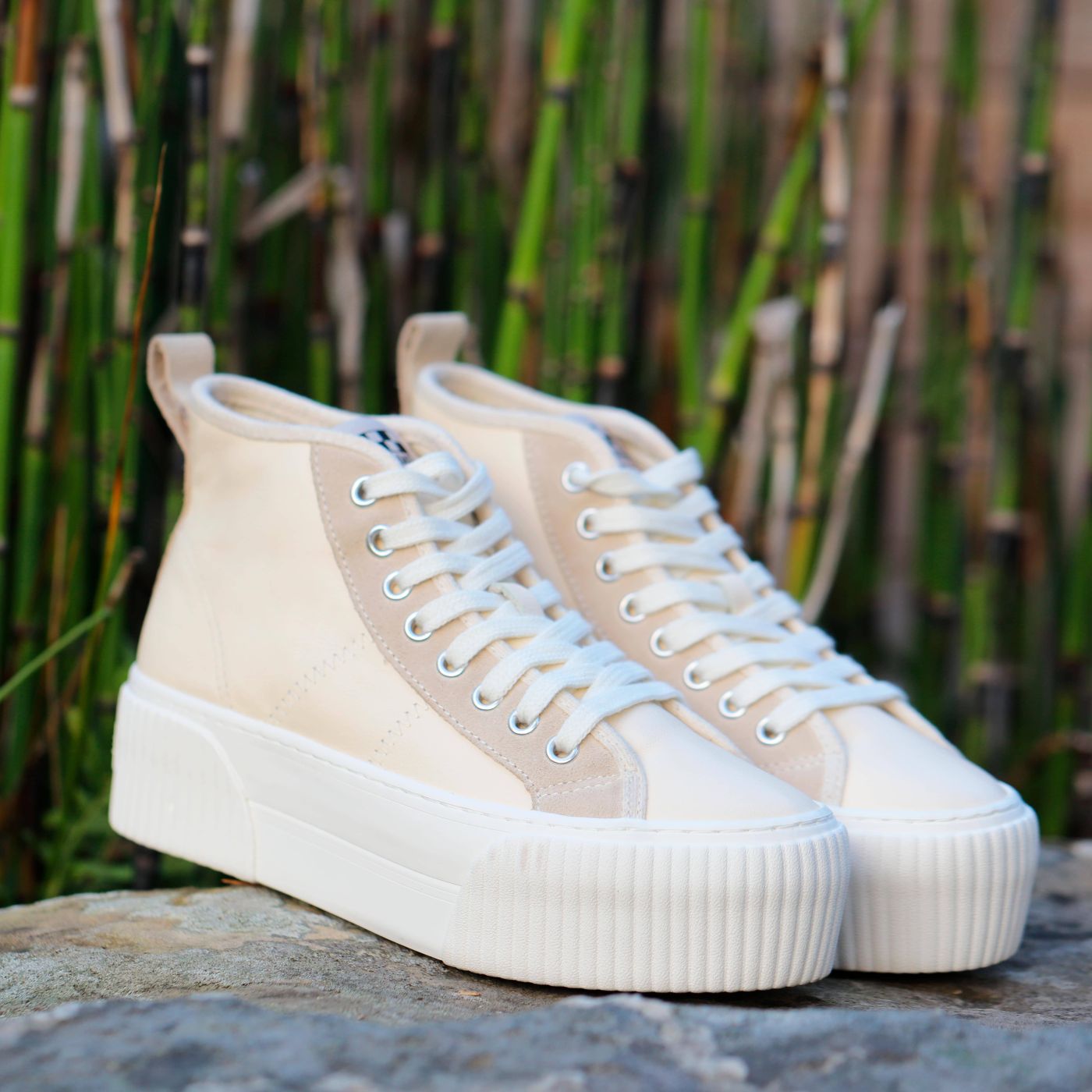 NO NAME a imaginé l’IRON MID dans une version à la fois douce et lumineuse. Une sneaker montante solaire d’inspiration punk avec sa semelle striée qui n’est pas sans rappeler les indémodables creepers.