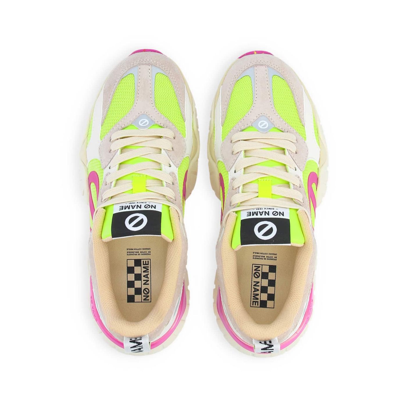 Dans cette version particulièrement colorée, la KRAZEE RUNNER est parfaite pour ajouter une dose d'énergie et de modernité aux looks de l’été. Réalisée dans une alliance de mesh recyclé* jaune fluo et de cuir velours nude, elle est rehaussée de touches blanches et rose fluo. Toujours posée sur une semelle graphique ultra légère signée NO NAME, la KRAZEE suscitera toutes les convoitises.- Dessus en cuir de vachette velours et mesh recyclé* certifié GRS- Logos XXL sur les côtés- Doublure en textile- Première de propreté amovible en coton biologique certifié GOTS- Languette logotypée à l’arrière- Semelle bicolore de 4 cm en EVA et caoutchouc recyclé*