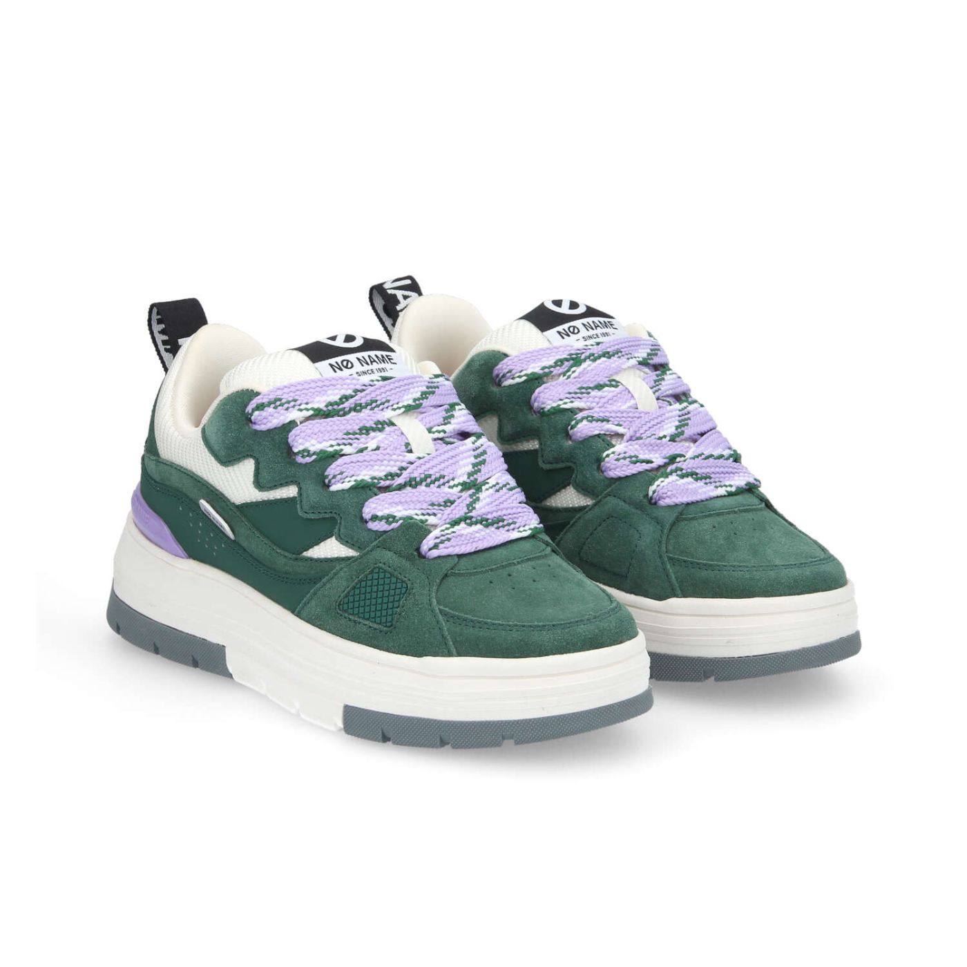 Découvrez la NOLLIE SNEAKER de NO NAME, une basket femme chunky inspirée des années 2000 et du skate. Avec ses patchs de cuir vert et ses touches de violet, elle offre un look travaillé et haut de gamme. Sa semelle épaisse de 5 cm en EVA et caoutchouc assure un excellent amorti, tandis que les renforts au talon, col et languette garantissent un confort inégalé. De larges lacets skate accentuent son caractère urbain, tandis que la plateforme ajoute une nouvelle dimension à ton look.- Dessus en cuir de vachette, nubuck et polyester - Col et languette rembourrées en mousse recyclée- Renfort de protection à l’arrière du talon- Étiquette logo brodée sur la languette- Tirette logotypée à l’arrière - Doublure textile polyester - Première de propreté amovible en textile polyester- Lacets skate XXL + deuxième paire ton sur ton- Semelle extra légère de 5 cm en EVA et caoutchouc