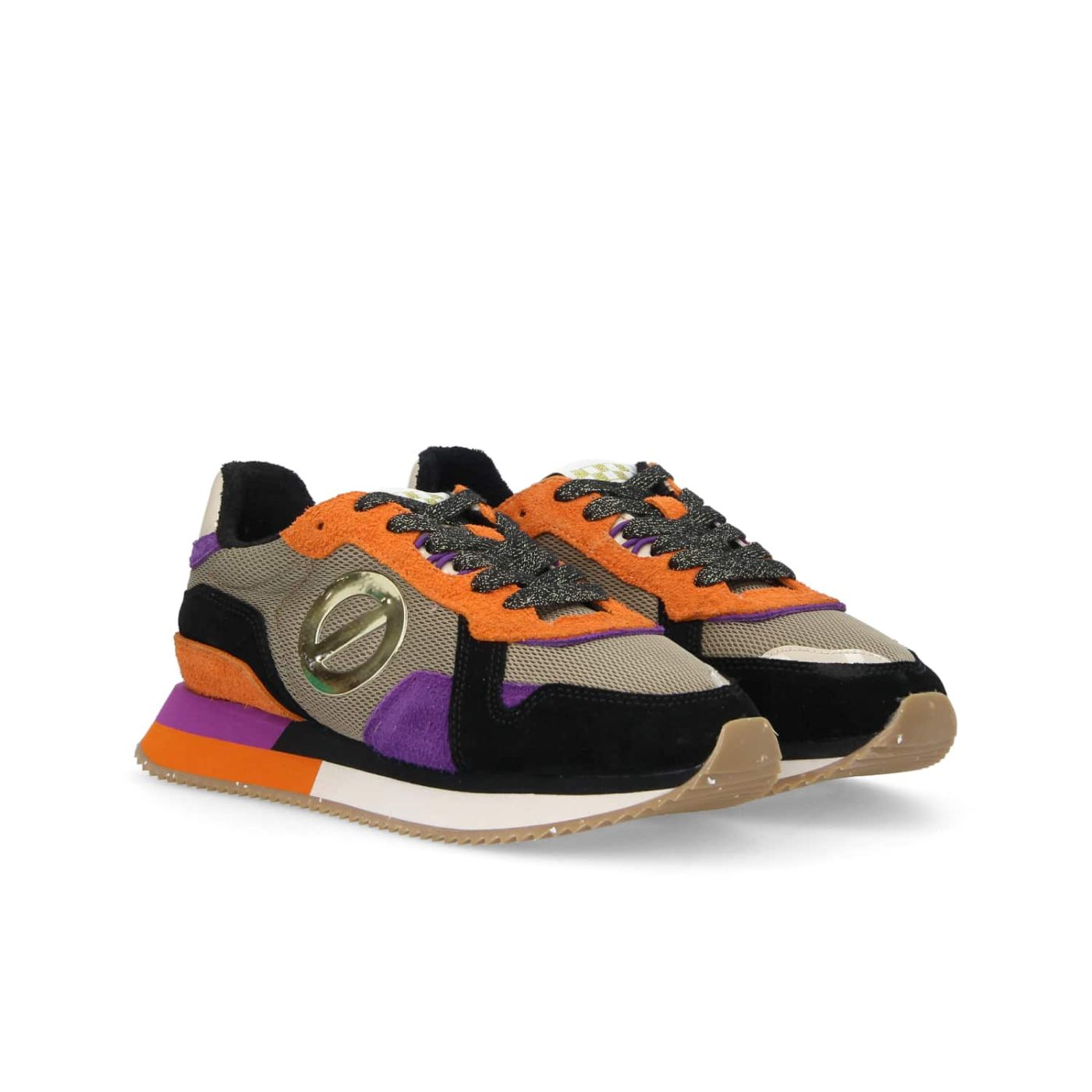 Découvrez la MIA NEW JOGGER de NO NAME : une sneaker femme d'inspiration vintage au accents haut de gamme, alliant couleurs vives et style running. Avec ses empiècements en cuir velours violet, orange et noir sur une base de toile taupe, elle est reconnaissable par son logo doré oversize. Sa semelle en EVA et caoutchouc recyclé assure un amorti optimal, tandis que la doublure en polyester éponge et la première de propreté en cuir de chèvre garantissent un confort exceptionnel. Parfaite pour un look urbain dynamique et confortable !