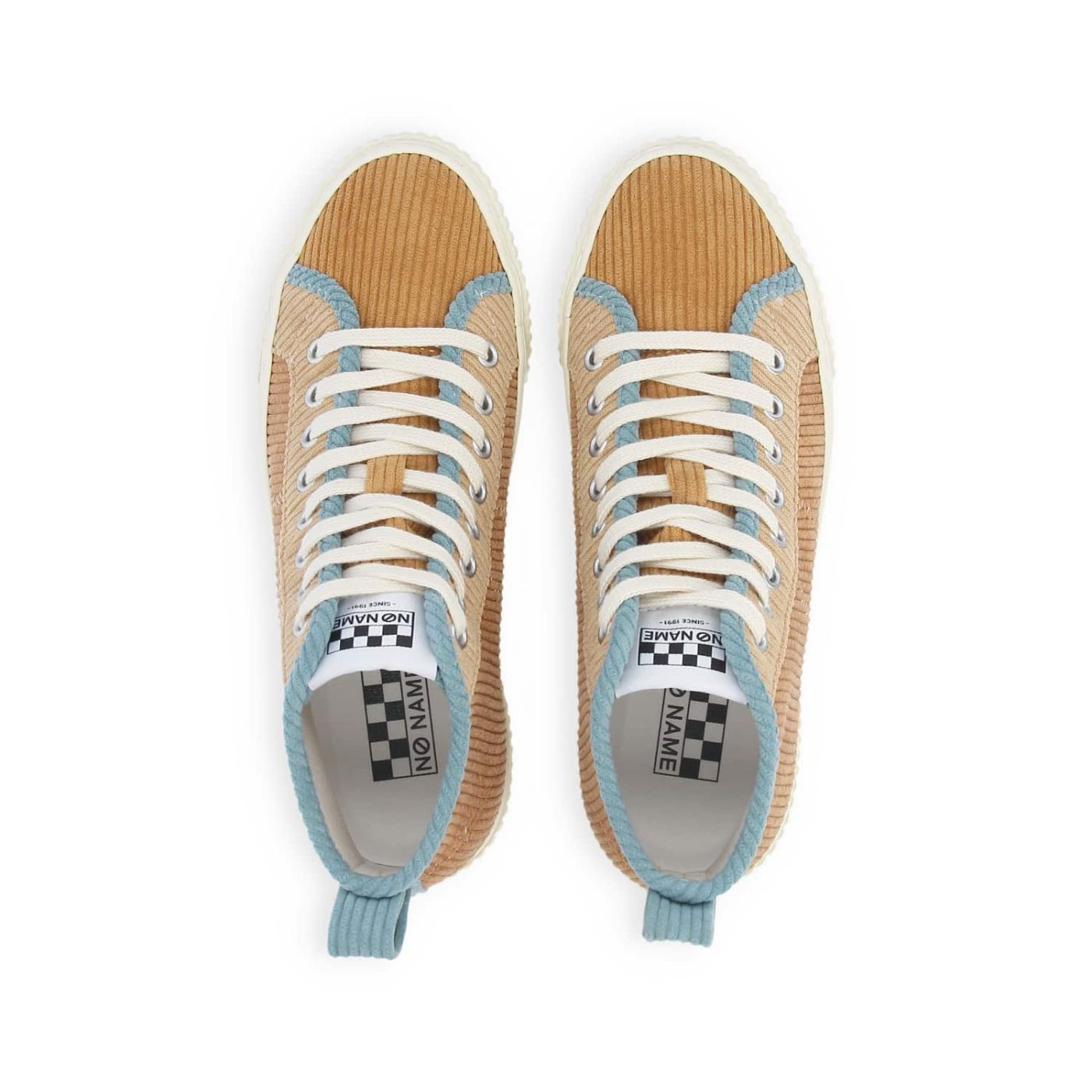 The IRON MID is a design that harks straight back to the 1990s. This extraordinary sneaker is out in a soft version, with a nougat/hazelnut colourway and a velvety waffle weave upper for a deliciously charming vintage look. -High-top textile upper -Polyester lining -Removable GOTS-certified organic cotton canvas insole -Pull-tab with logo on the collar -Embossed NO NAME logo on the back of the sole -5 cm rubber sole with a toe and heel bumper -Vulcanised sole reinforced with side topstitching