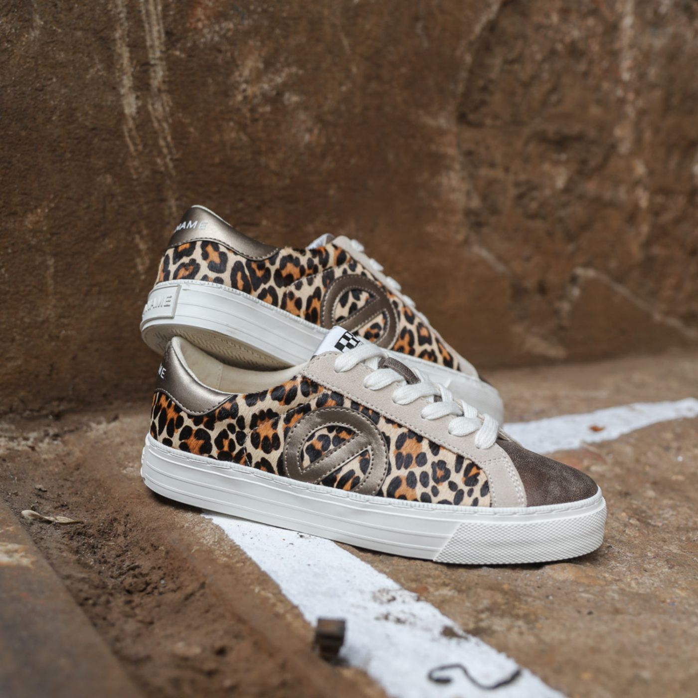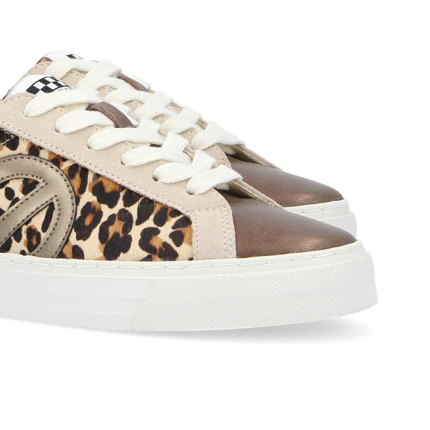 Treat yourself to this leopard print version of NO NAME's STRIKE SIDE, a comfy, bold women's sneaker. Its leopard-print foal skin-effect leather upper is trimmed with nude suede and bronze metallic inserts for a unique retro style. It's set on a sturdy 3 cm tennis shoe-style sole and lined with GOTS-certified organic cotton for an eco-friendly finish. Perfect for a chic and eco-responsible urban look. -Calf hide, calfskin suede and synthetic upper -Heel counter insert with printed logo and side logos -100% GOTS-certified organic cotton lining -Removable GOTS-certified 100% organic cotton insole -Flat cotton laces & eyelet-free lace guard -3 cm rubber sole -Vulcanised sole reinforced with side topstitching