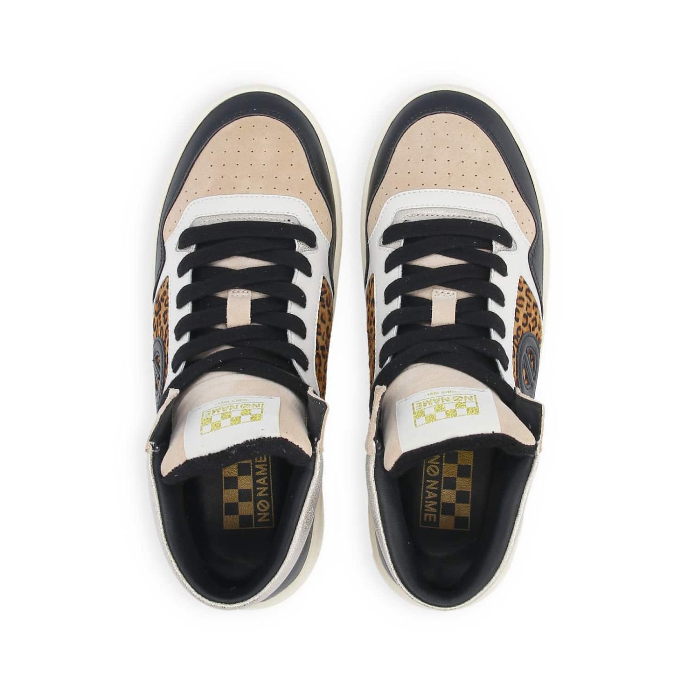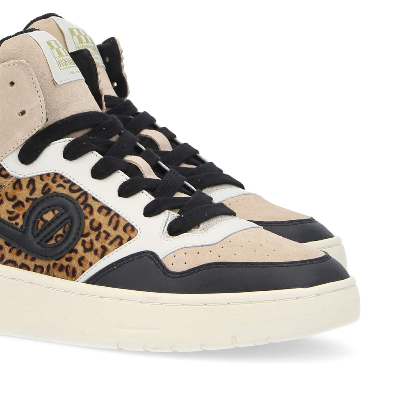 NO NAME's KELLY MID is elegantly embracing the animal print trend. This high-top sneaker is crafted from smooth leather, suede and a synthetic textile and set on an ultra-comfy, extremely durable 4 cm cemented rubber sole reinforced with side stitching. It combines beige suede, smooth black leather and long-haired leopard print suede, enhanced by a golden patch on the collar. A goat leather insole ensures even more comfort. With its retro logo and vintage twists, it will add a bold, uninhibited touch to all your urban looks. -Smooth leather, long-haired calfskin suede and synthetic textile upper -Retro logo on the sides -Textile and leather lining -Removable goat leather insole -Flat laces -4 cm rubber sole -Cemented sole reinforced with side topstitching