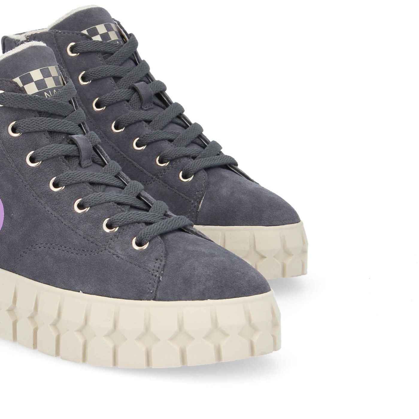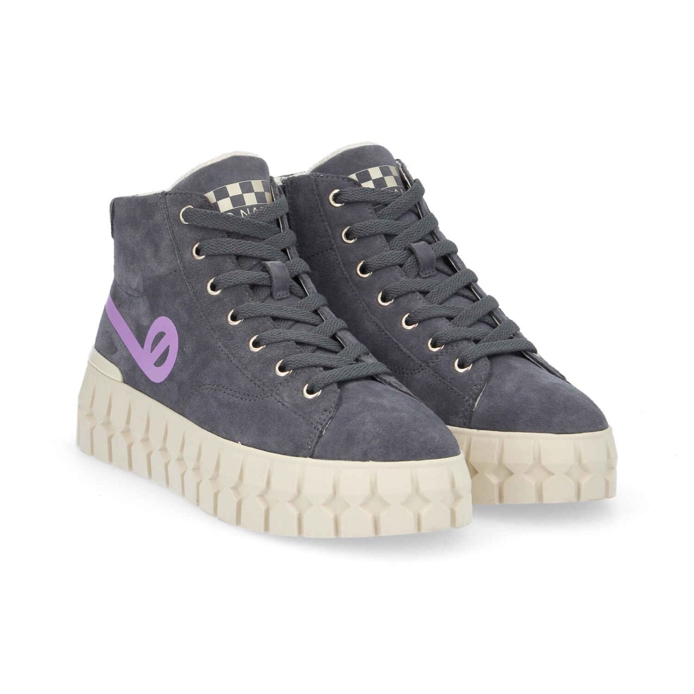NO NAME has come out with a new take on vintage styles with the PLAY MID, a grey suede high-top platform sneaker. This extremely lightweight sneaker is trimmed with retro purple logos that match the laces. Its lugged rubber sole ensures excellent cushioning and grip, while the organic cotton insole reduces its environmental impact. This comfy high-top will boldly up your height and your style. -Calfskin suede upper -XL logo on the sides -Heel insert with printed logo -Polyester textile lining -Removable GOTS-certified 100% organic cotton insole -Flat laces -4.5 cm sole