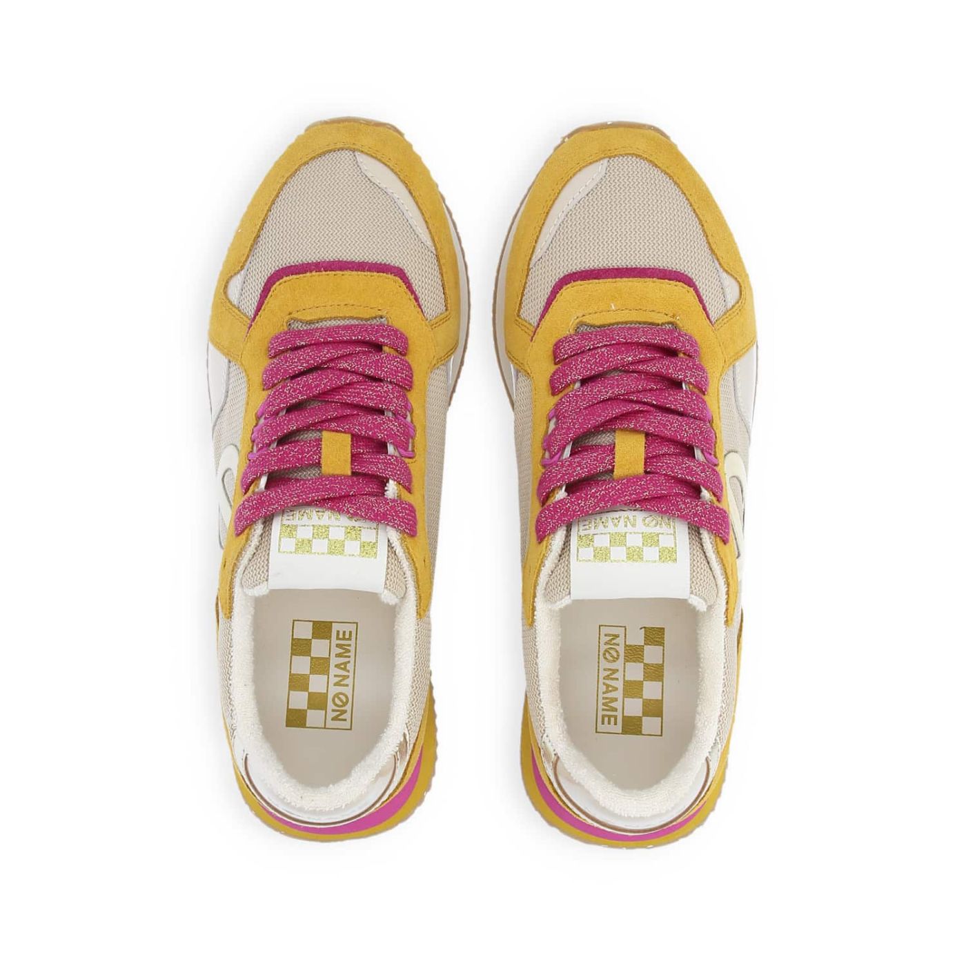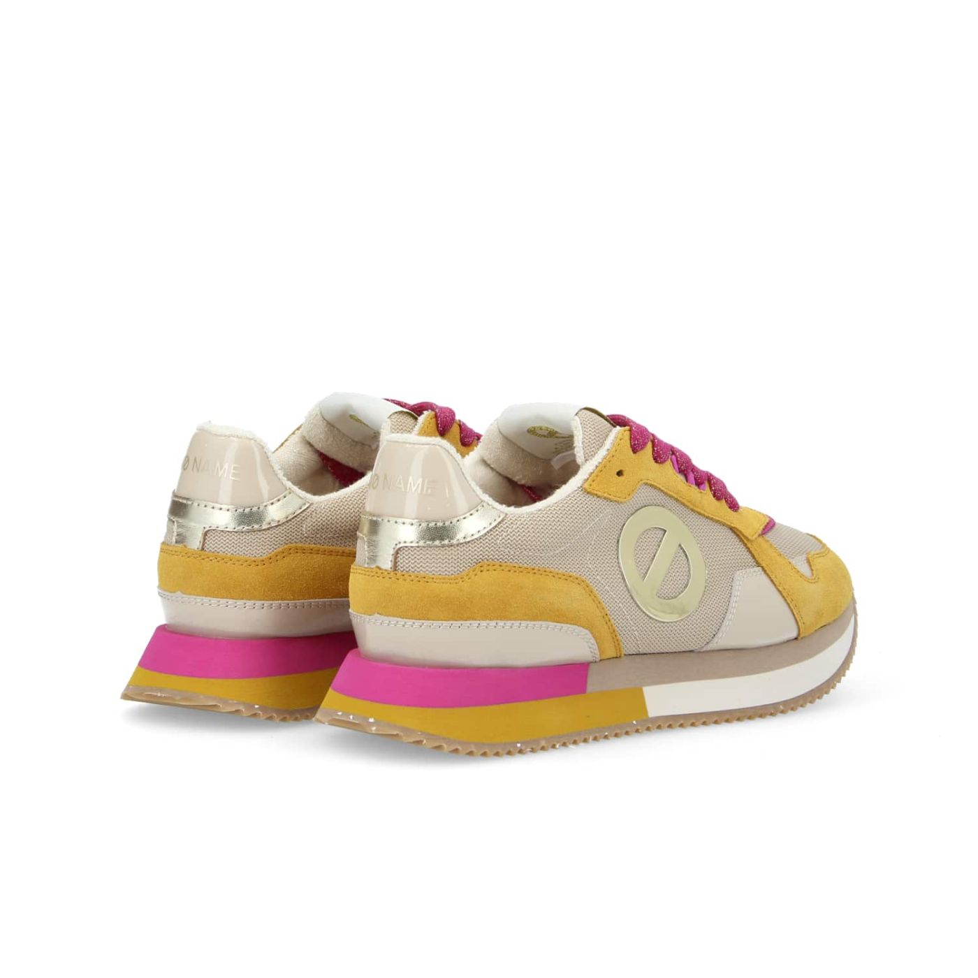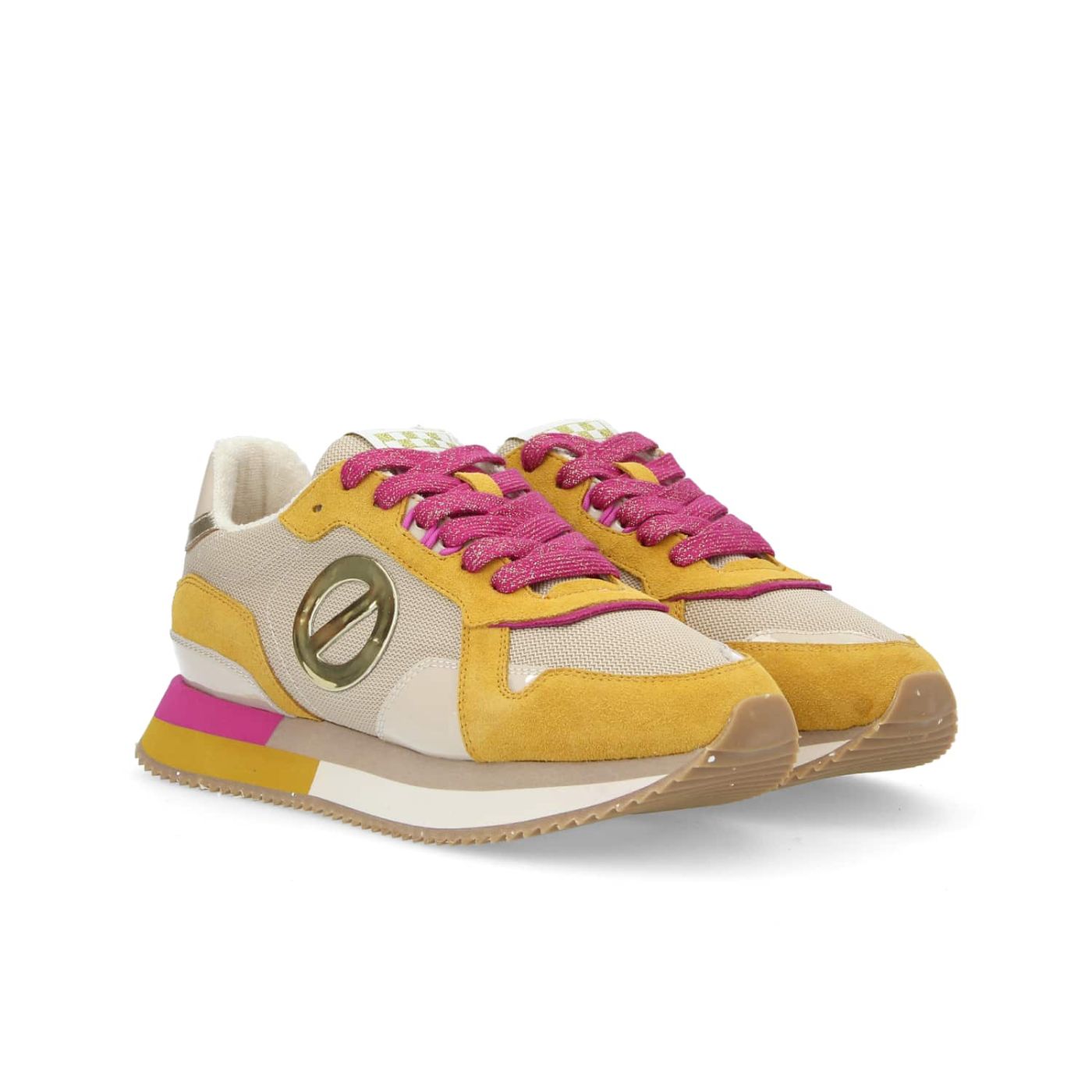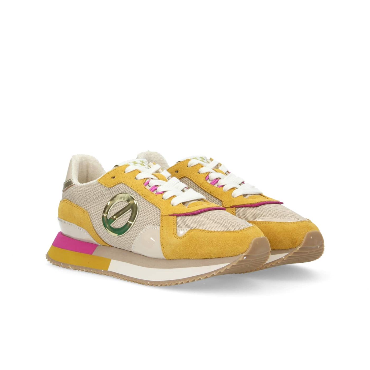 This MIA NEW JOGGER will add a zesty touch to your urban looks! It has a polyester upper with a calfskin heel counter and combines corn yellow suede inserts, pearlescent patches, hints of fuchsia and a golden logo. This ultra-comfy sneaker has an EVA and recycled rubber sole for optimal cushioning, a polyester terrycloth lining and a goat leather insole for a sneaker that will handle all your urban adventures. A go-to women's sneaker with an exquisite urban style that doesn't compromise on luxurious comfort. -Calfskin suede and polyester upper -XL logo on the sides -Embroidered logo label on the tongue -Metallic heel insert with logo -Polyester terrycloth lining -Removable goat leather insole -4-colour 3 cm EVA and recycled rubber* sole -Comes with a second pair of laces